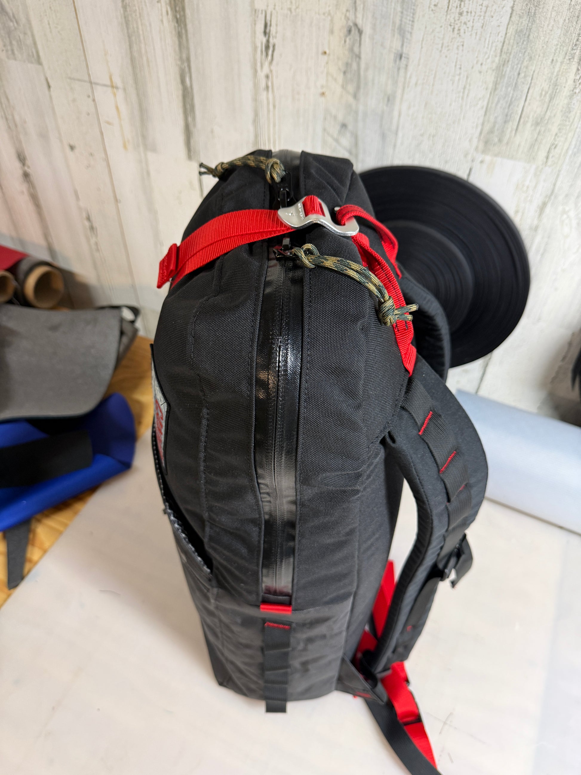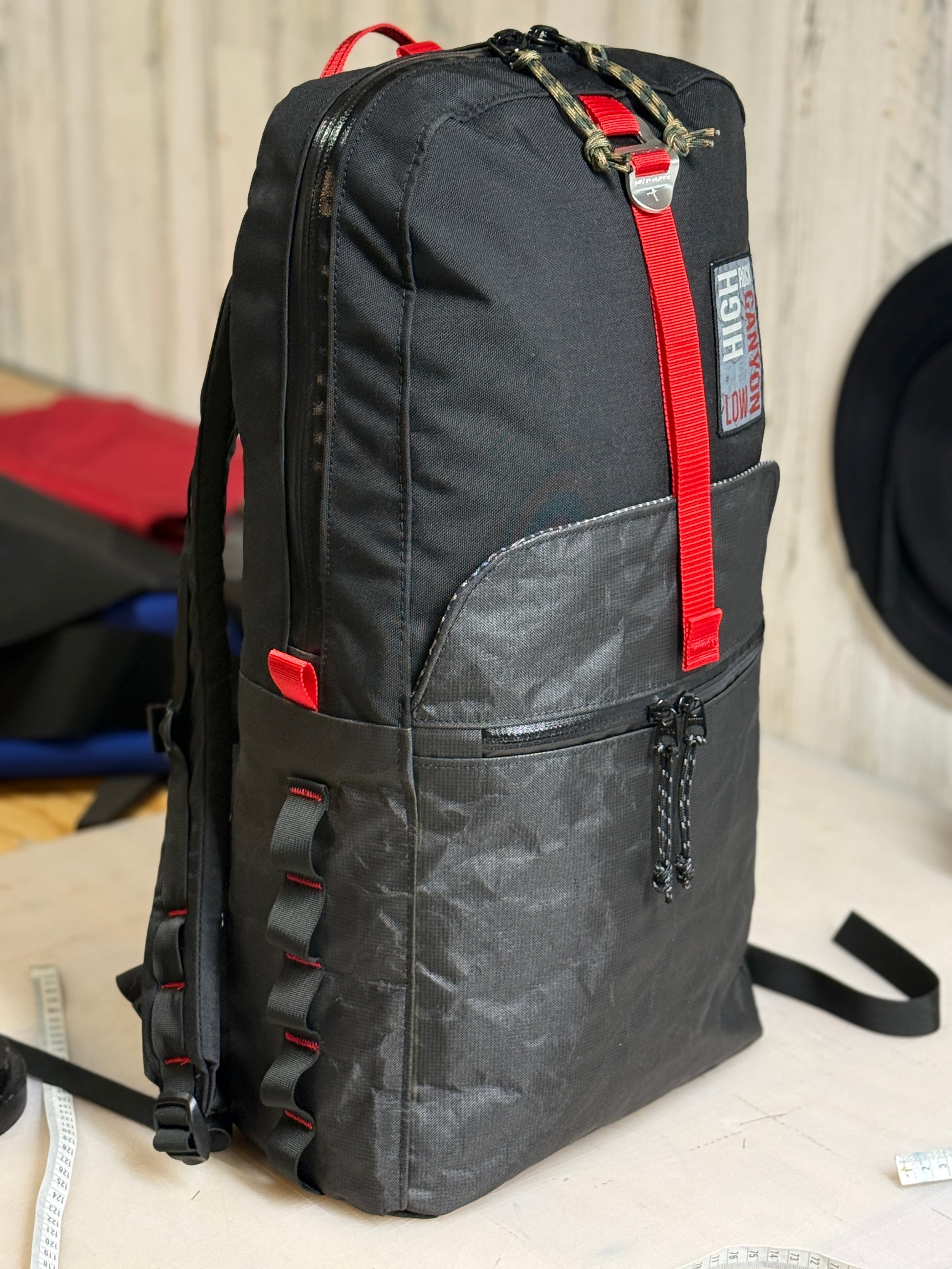 An heirloom bag inspired by the climbing bags of the 60's and 70's. Classic design with modern fabrics! Bag is constructed with 1000 denier Cordura from Brookswood and Black magic 400 ultra weave from challenge sailcloth. 1/2 inch evazote foam shoulder straps. Fastex buckles. Removable 1 inch webbing belt. Removable internal back pad. Climb, hike or travel, this bag will be with you for decades!