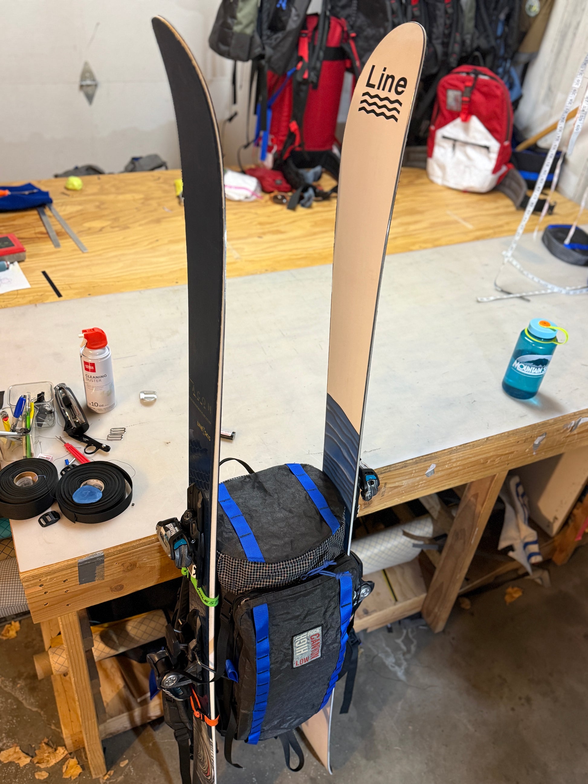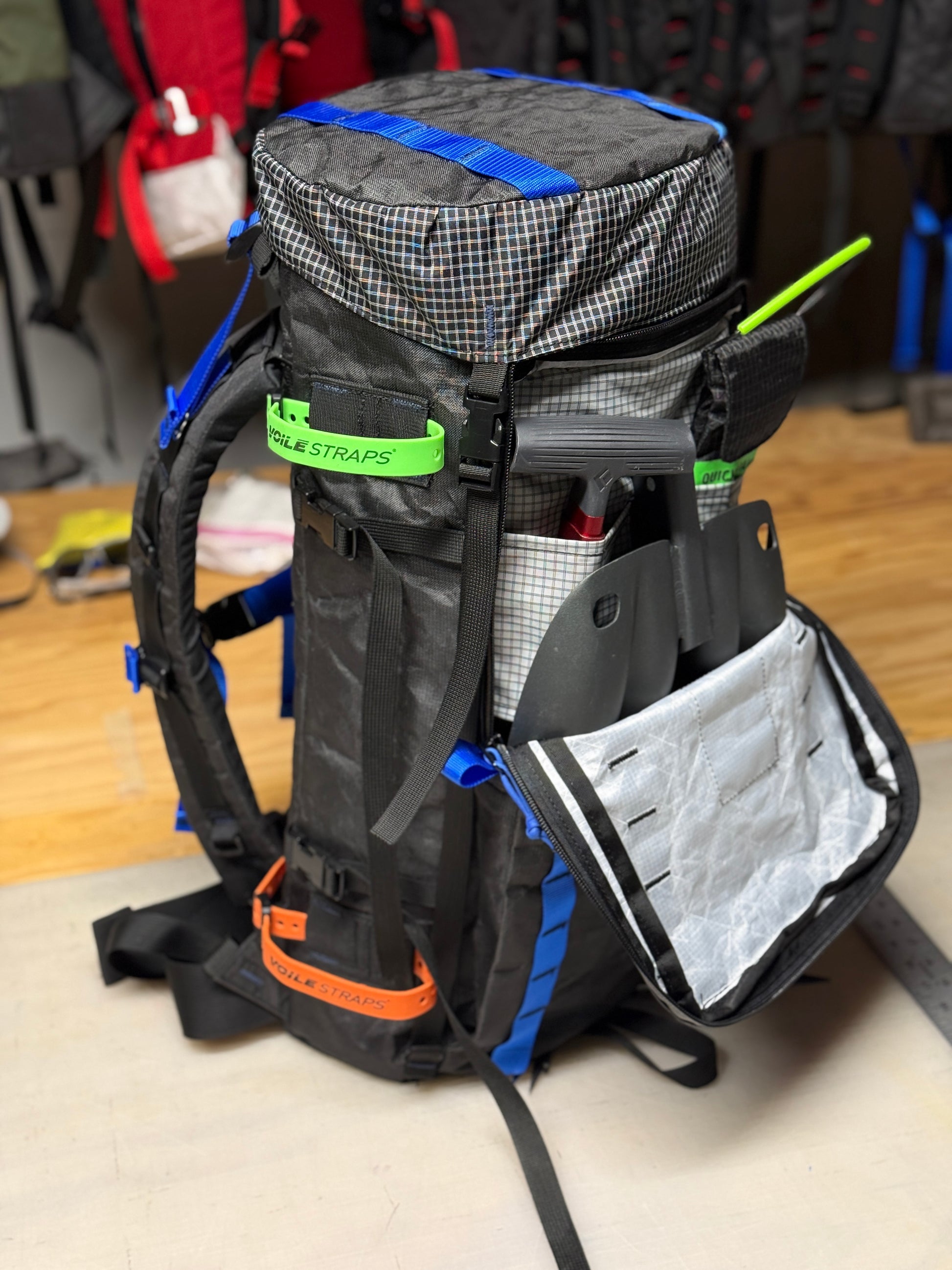 Secure your skis vertically along the side of the pack using reinforced 2" webbing attachment points with Voile straps